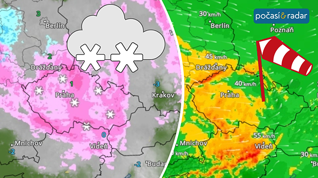 Meteoradar, screenshot, 30. 12. 3:00: V průběhu noci na úterý bude Česko od severu přecházet pásmo sněhových srážek.