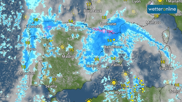 Ve Španělsku podél pobřeží Středozemního moře od Valencie k Barceloně a v Pyrenejích může do víkendu spadnout 50 až 100 litrů srážek na metr čtvereční. Na návětří horských hřebenů není lokálně vyloučena ještě větší akumulace srážek.