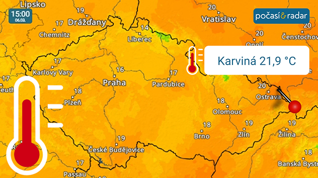 Podle informací Českého hydrometeorologického ústavu v rámci Česka naměřila ve čtvrtek zcela nejvyšší maximální teplotu stanice v Karviné - jen jediná desetina stupně zde chyběla k dosažení plných 22 °C.