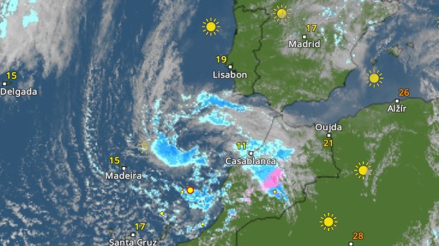 Saharský prach zakrývá oblohu nad jihozápadní Evropou a zbarvuje mraky do žluta.