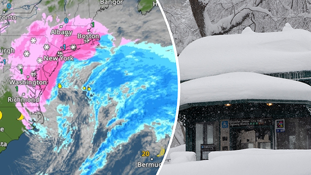 Na obrázku je vidět osoba se sněhovou frézou. Na střechách aut leží spousta sněhu.
