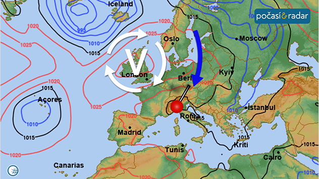 Evropská meteorologická mapa s tlakovou níží u Islandu a tlakovou výší nad Itálií. Jsou vyznačeny izobary a směrové šipky.