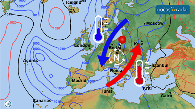 V prostoru tlakové níže se nad střední Evropou v těchto dnech utváří výrazné frontální rozhraní na střetu chladného proudění na severu až severozápadě regionu a teplého proudění na jihu a jihovýchodě regionu.